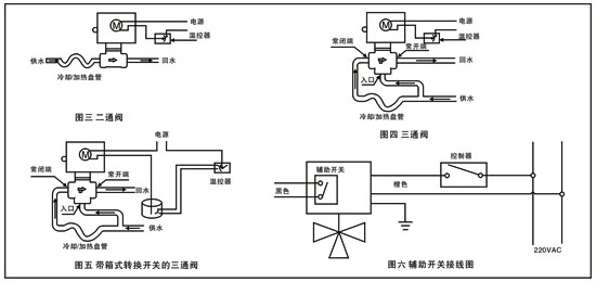 常閉二通閥和混合三通閥的安裝如圖形3、4所示。對(duì)于高層建筑物,應(yīng)在底層支管上采用減壓閥。安裝閥體時(shí),應(yīng)注意閥體的箭頭指向,若帶有輔助開關(guān),其接線如圖6所示。