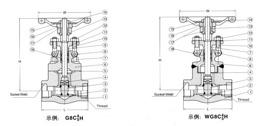 絲口鍛鋼閘閥、焊接式鍛鋼閘閥: 絲口鍛鋼閘閥、焊接式鍛鋼閘閥有三種閥蓋設計形式。第一種是螺栓式閥蓋,按這種設計形式設計的閥門,其閥體與閥蓋用螺栓螺母連接,纏繞式墊片(316夾柔性石墨制造)密封。客戶有特殊要求時也可采用金屬環連接。第二種設計形式是焊接式閥蓋,按這種設計形式的閥門,其閥體與閥蓋用螺紋連接,全焊密封??蛻粲刑厥庖髸r也可采用全焊透連接。第三種是壓力自緊式閥蓋,按這種設計形式設計的閥門,其閥體與閥蓋螺紋連接,內壓自密封環密封。