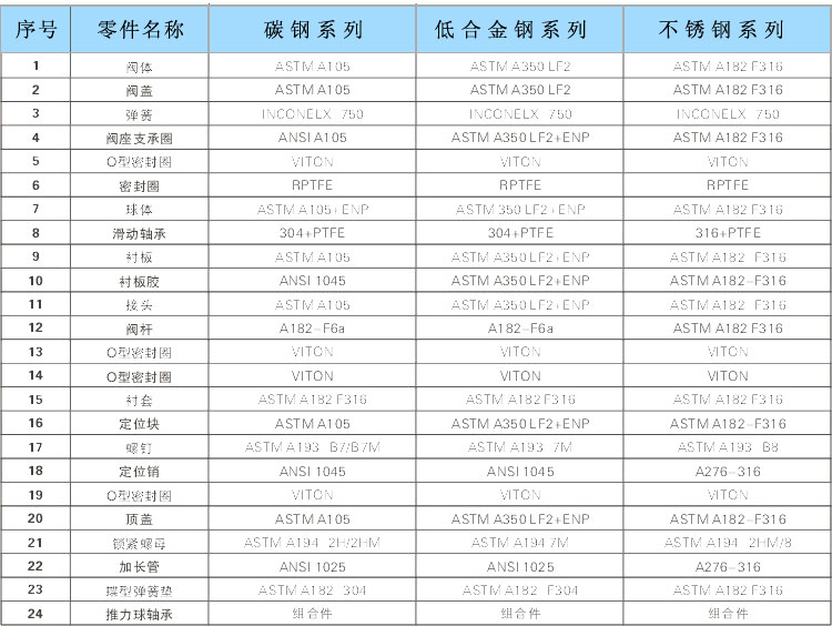 2.由于閥座是由碳化特氟隆密封環及咖彈簧構成的,所以對壓力和溫度的變化適應能力強,在標注壓力和溫度范圍內不會產生任何泄滑。