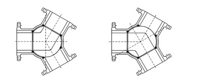 Y型三通球閥有相互成120°和兩通孔成135°,根據需要可實現對介質流向切換兩種工況。